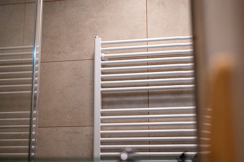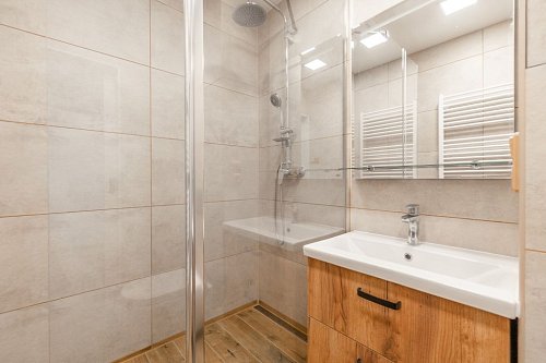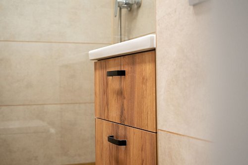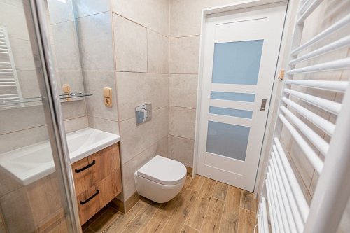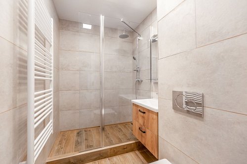 Koupelna je vybavena sprchovým koutem s nastavitelnou zástěnou.