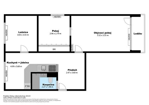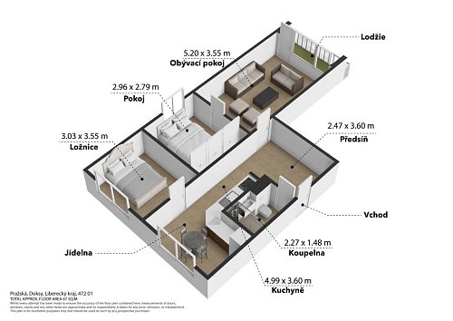 Celková užitná plocha bytu dle prohlášení vlastníka činí 64,4 m², přičemž součástí je také zamykatelná komora (1,2 m²) umístěná na chodbě před bytem. K bytu dále náleží zasklená lodžie o velikosti 4 m² a sklepní kóje v suterénu domu o velikosti přibližně 4 m².