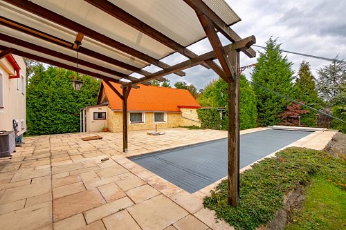 Hlavní dům o dispozici 4+kk s užitnou plochou 196 m² byl kompletně rekonstruován v roce 2012. Na rozsáhlém pozemku o výměře 2 259 m² najdete nejen pečlivě udržovanou zahradu, ale také vyhřívaný bazén, venkovní gril a samostatnou stavbu – vejminek 1+kk vhodný pro hosty, prarodiče či pronájem.